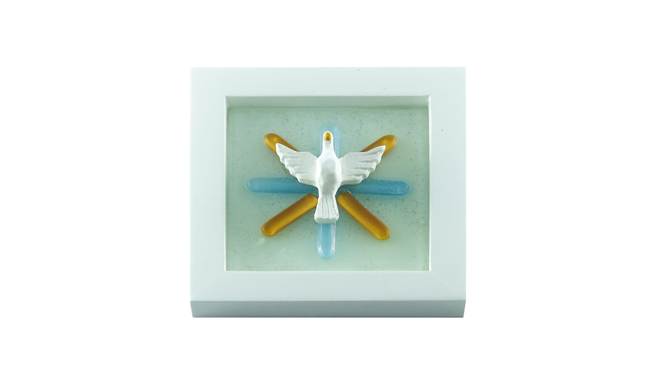 Quadro Divino Espirito Santo Pequeno Ocre Opaco e Turquesa Claro Transparente moldura em MDF laqueado de branco e obra feita em vidro fusing