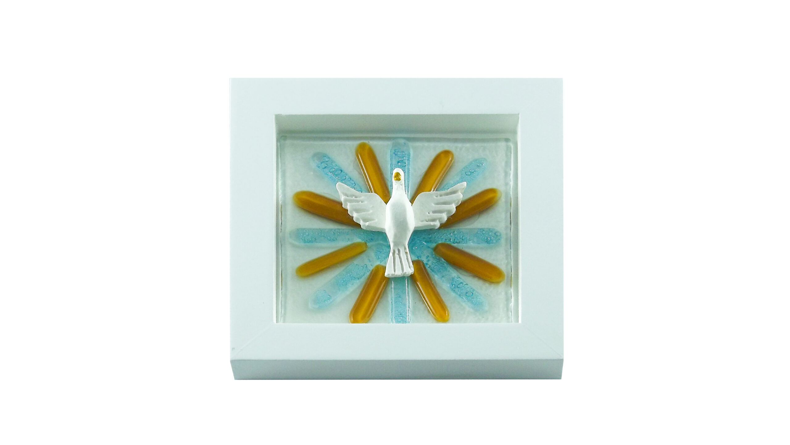 Quadro Divino Espirito Santo Pequeno Ocre Opaco e Verde Claro Transparente moldura em MDF laqueado de branco e obra feita em vidro fusing