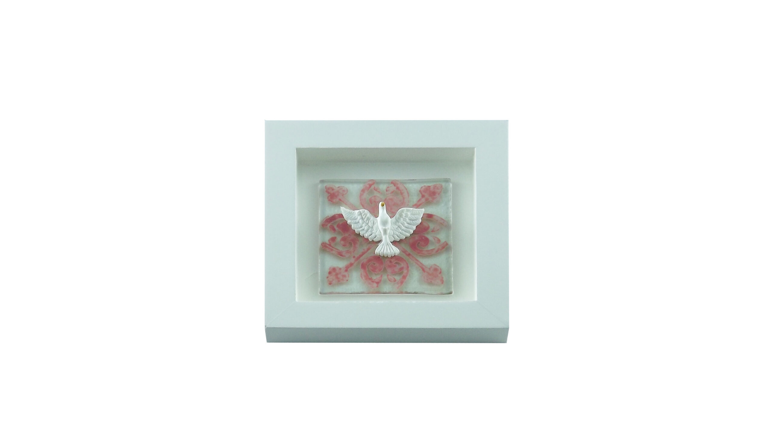 Quadro Divino Espirito Santo Pequeno Mandala Rosa Opaco moldura em MDF laqueado de branco e obra feita em vidro fusing