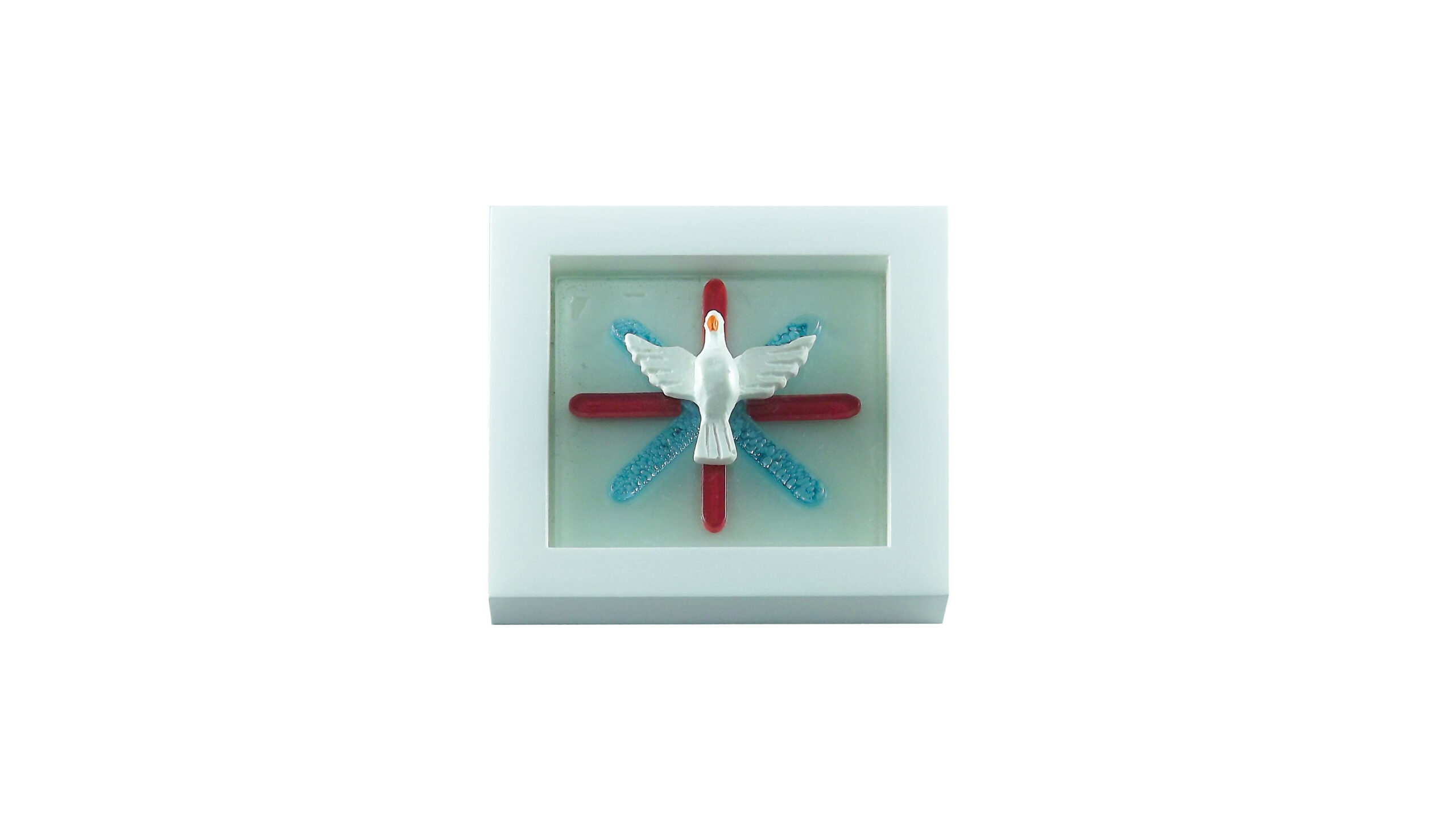 Quadro Divino Espirito Santo Pequeno Vermelho e Turquesa Egípcio Transparente moldura em MDF laqueado de branco e obra feita em vidro fusing